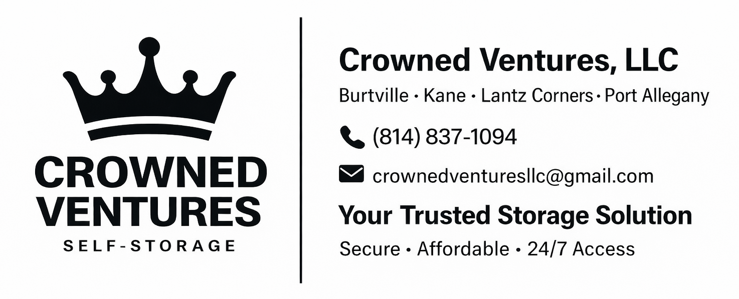At Crowned Ventures, LLC, we provide reliable, affordable storage solutions that keep your belongings safe and accessible. With four convenient locations—Burtville Self-Storage, D&S Mini-Storage, Kane Self-Storage, and Port Allegany Self-Storage—we offer a variety of unit sizes for both personal and business needs. As a family-run business, we value trust, deliver exceptional customer service, and take pride in understanding the unique needs of every customer.